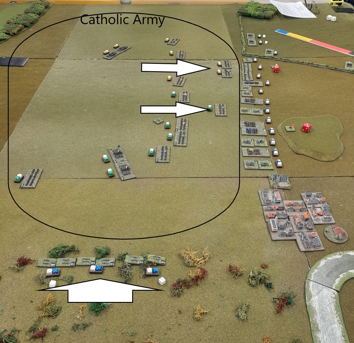 The Catholic Army has all its cavalry in the centre and the pike and shot infantry on the flanks. They have no artillery. Apparently, in the battle, the artillery was so badly deployed that it at no impact at all.