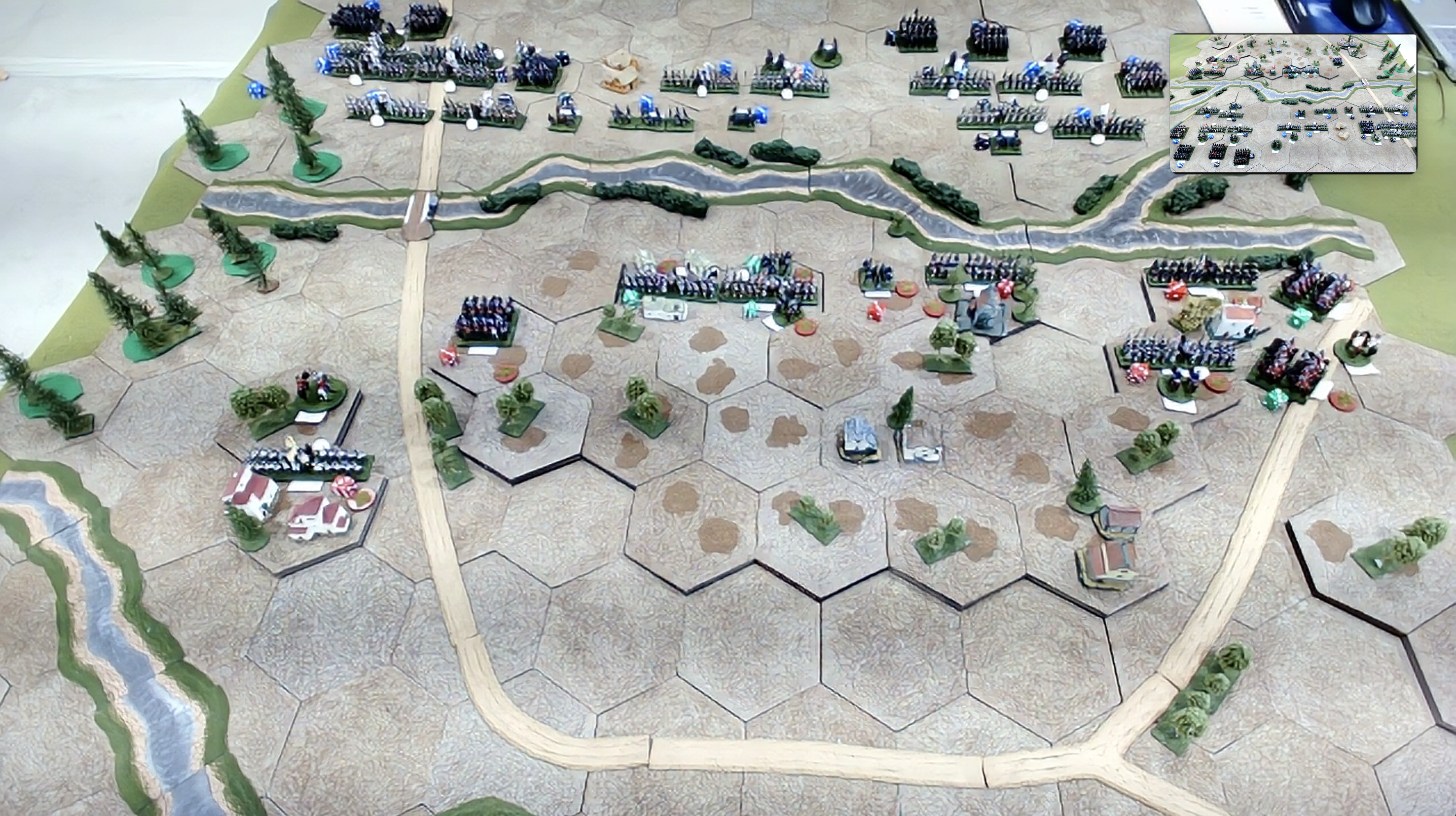 | The starting depositions. All units are on reserve orders ready to spring to life at advantageous moments! My light infantry unit are currently hidden from view in the woods by the river on the left. |