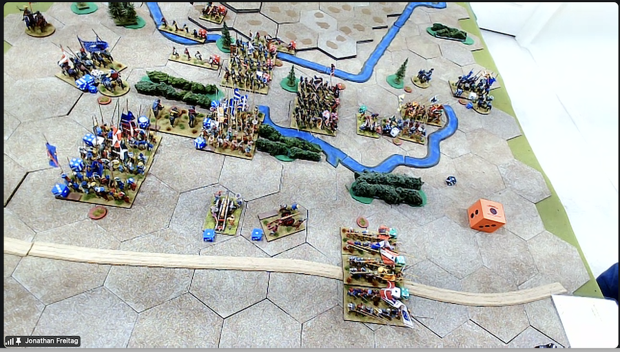Carpi, on the Venetian left is clearly an aggressive soul. Grabbing the initiative, his leftmost pike (French right) is hurled at the hesitant Swiss.